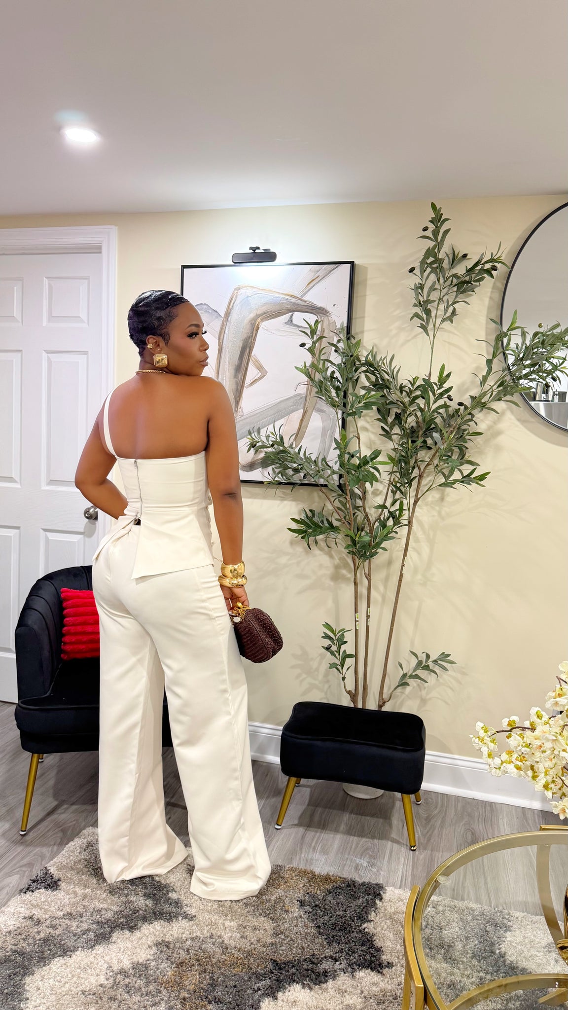 Nude Pants Set with Laced one shoulder top. Back Zipper Closure